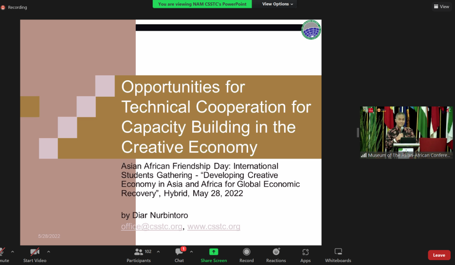 BANDUNG (May 28, 2022): Diar Nurbintoro, Acting Director of the Non-Aligned Movement Centre for South-South Technical Cooperation (NAM CSSTC) at the Asia-Africa Museum, attended a half-day International Seminar for students from Asia and Africa on "Developing Creative Economy in Asia and Africa for Global Economic Recovery."