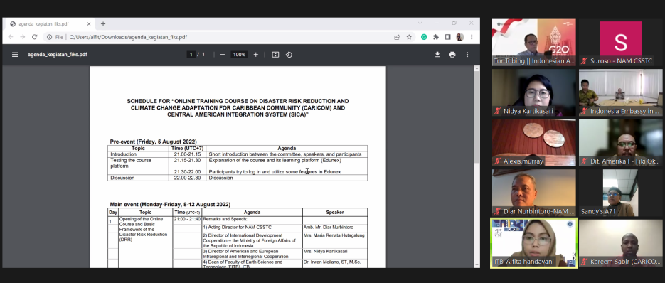 The Acting Director of the Non-Aligned Movement Centre for South-South Technical Cooperation and the Director of American and European Intra-regional and Interregional Cooperation of the Republic of Indonesia's Ministry of Foreign Affairs informed the Caribbean Community Secretariat about the planned implementation of the "Online Training Course on Disaster Risk Reduction and Climate Change Adaptation. The information was communicated during a virtual meeting on August 3, 2022.