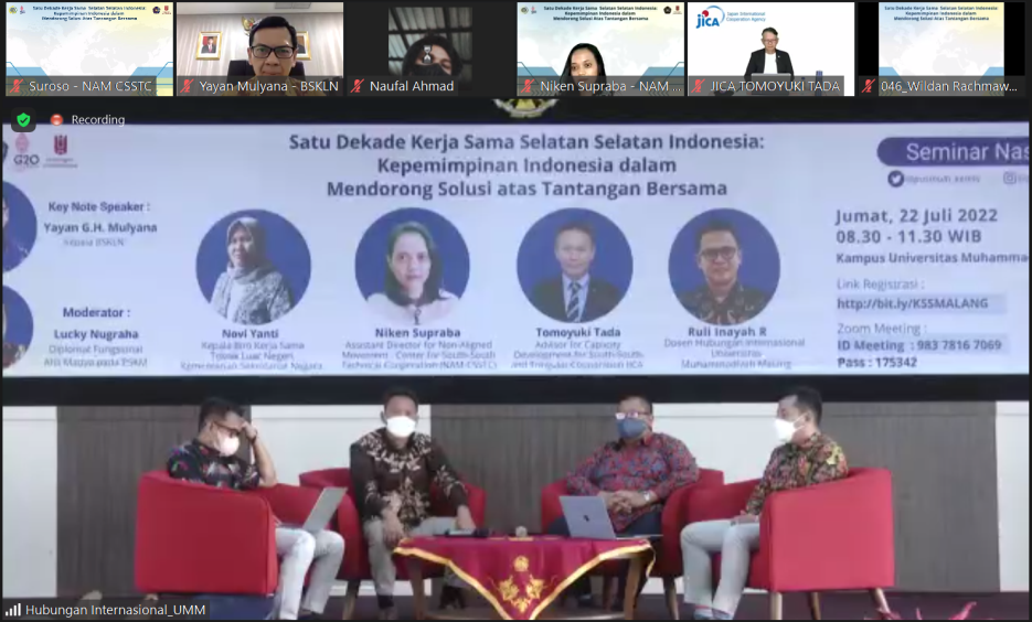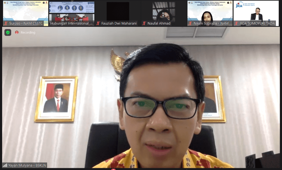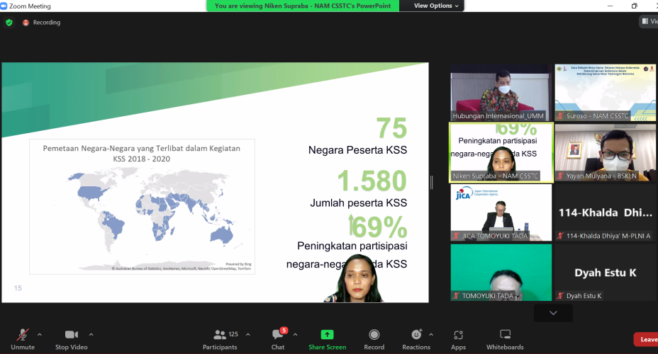 Niken Supraba, Assistant Director for Programme for the Non-Aligned Movement Centre for South-South Technical Cooperation (NAM CSSTC), delivered a presentation on "Achievements of One Decade of Implementation of South-South Cooperation NAM CSSTC" on 22 July 2022 in the Socialization of South-South Cooperation "One Decade of Indonesian SSC: Indonesian Leadership in Pushing Solutions to Common Challenges."