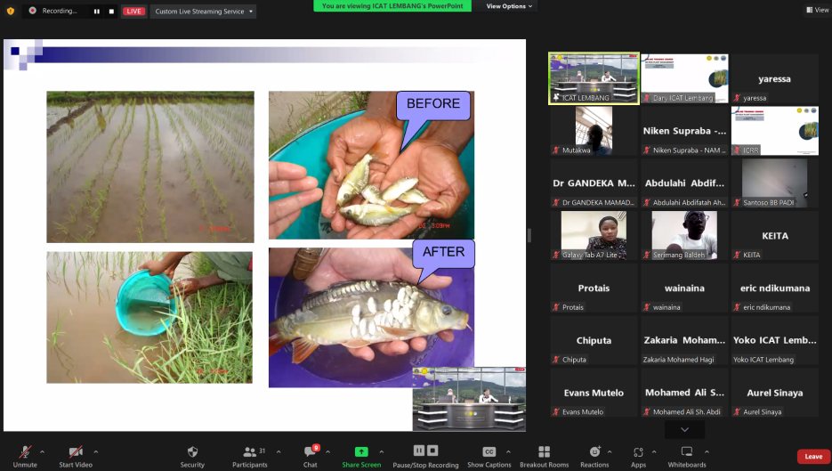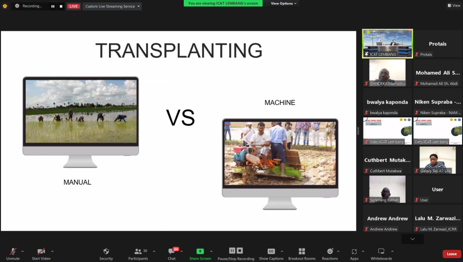Experts from the Indonesian Center of Agricultural Training of Lembang, Indonesian Rice Research Center, and Manobi Africa presented the material, which was titled "Success Story of Rice Management Training Cultivation," "Rice Integrated Crop Management in Indonesia," "Field preparation," "The Implementation of Rice Superior Varieties," "Rice Planting," "Fertilising and irrigation," "Pest and disease," "Weed management," and "Rice Harvest and Post-Harvest Management."