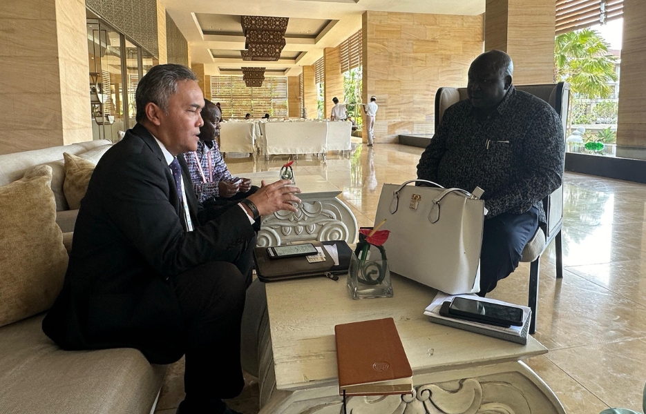 On September 3rd 2024, The Director of the NAM CSSTC, H.E. Ambassador Diar Nurbintoro was pleased and honored to be given the chance to welcome and meet with Uganda’s Minister of State for Foreign Affairs in charge of International Cooperation, Mr. Oryem Henry Okello in between the packed schedules of the 2nd IAF at the Mulia Hotel Bali. The main purpose of this meeting was to ask for and gain Uganda’s support for the potential NAM countries’ Briefing Session at the UN GA’s Ambassadorial Meeting.